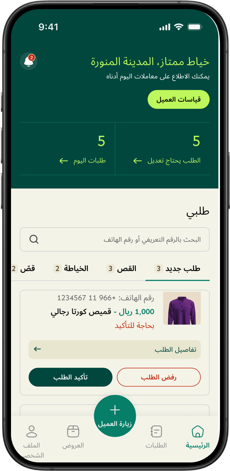 اعثر على خياطين محليين موثوقين، صمّم ثوبك حسب الطلب، وتابع خطوات الطلب مباشرة من هاتفك.