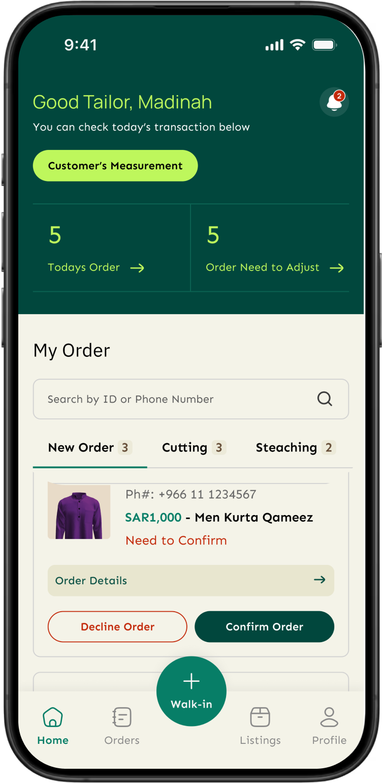 Find trusted local tailors, customize your garment, and track step all from your phone.
